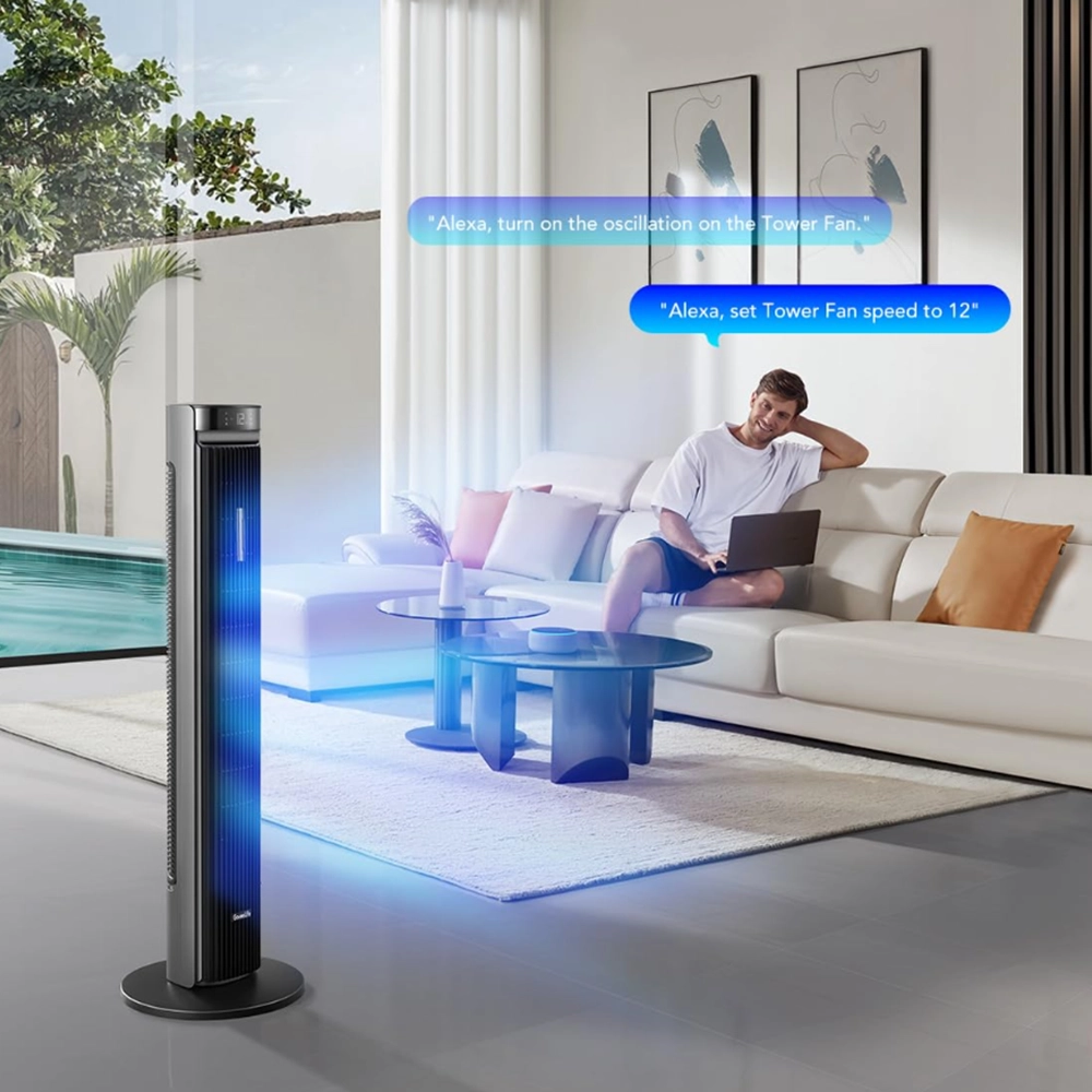 Keep cool with this smart tower fan featuring 150° oscillation, 12-speed settings, 5 modes, app & voice control, 24-hour timer, and ultra-quiet 27dB operation—perfect for bedrooms or home offices.