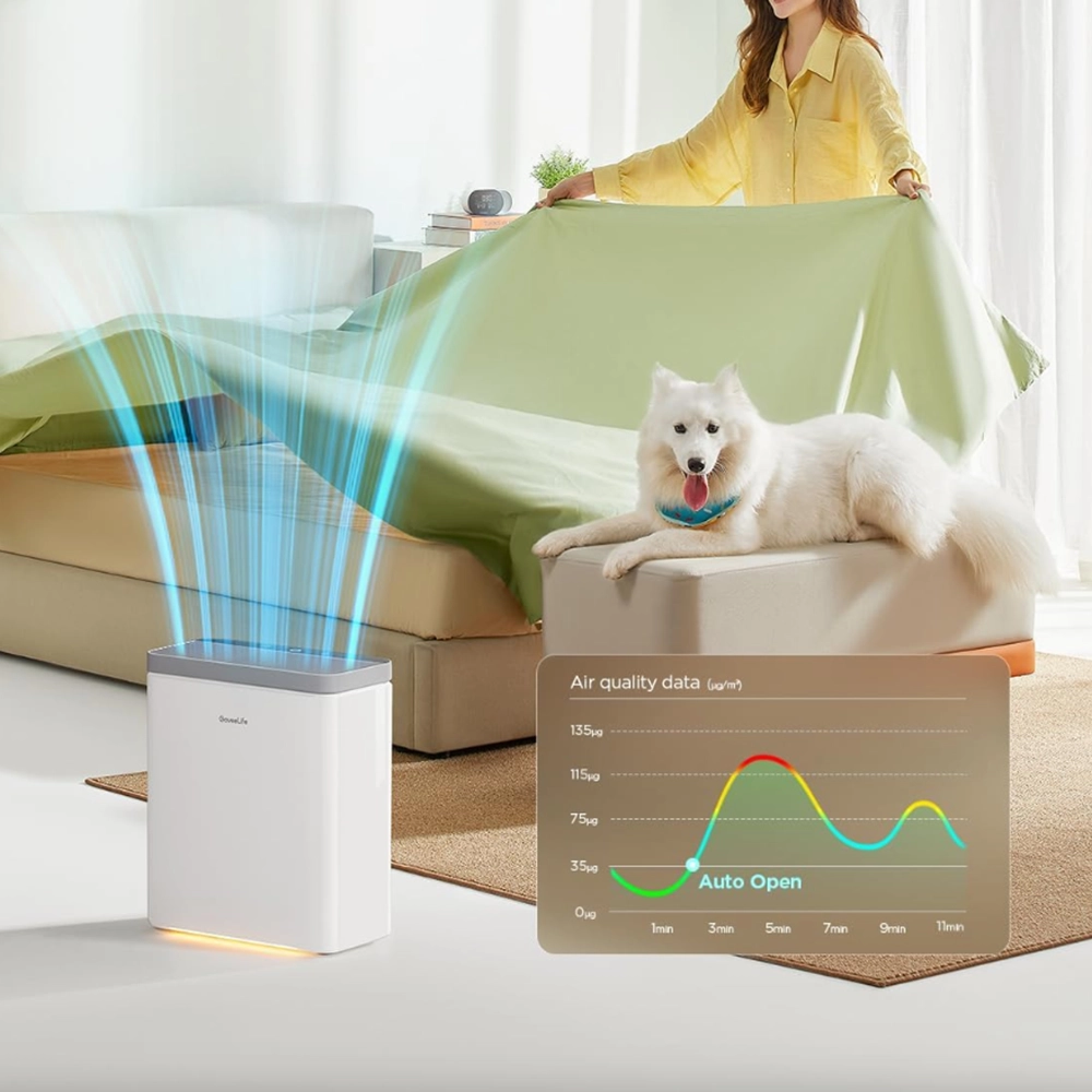 Clean and fresh air for large rooms up to 1,046 ft². Features PM2.5 monitor, 3-in-1 filter, sleep mode, and app/Alexa control—removes pet hair, odors, pollen, and smoke efficiently.